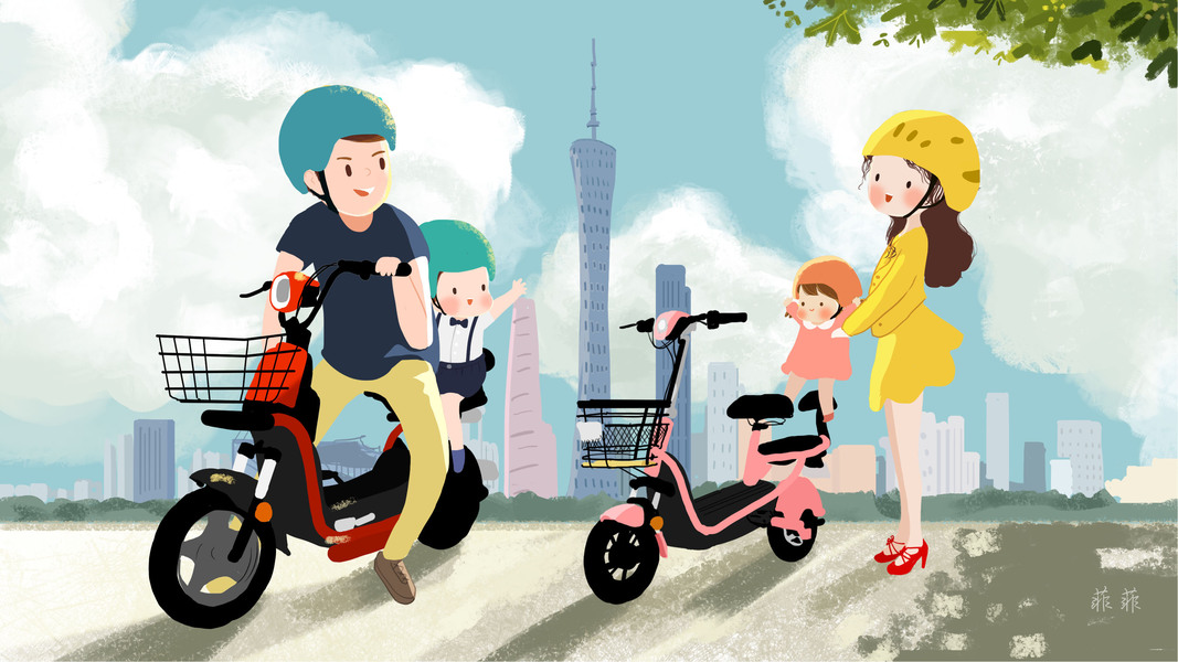 aima亲子电动车清新时尚唯美的商业海报插画