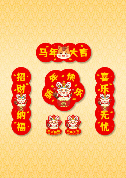 马年插画新年卡通可爱小对联春联冰箱贴图案设计